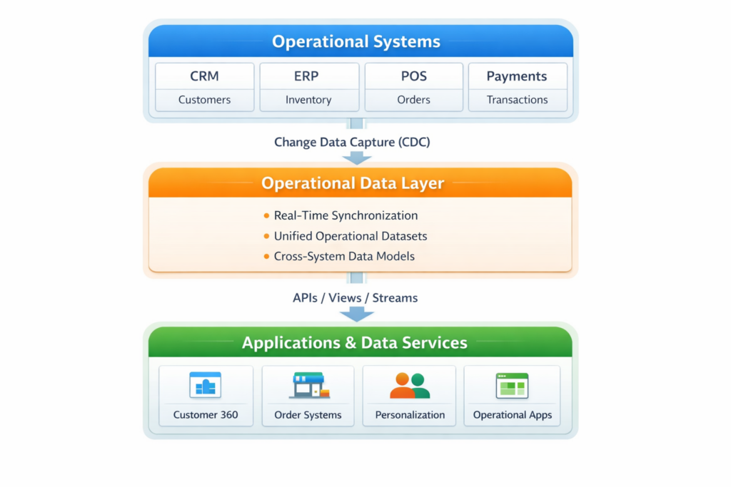 An operational data layer continuously synchronizes changes from operational systems and exposes unified datasets that applications can use directly.