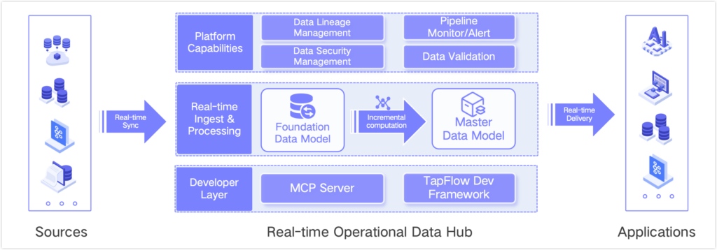 Operational Data Hub (ODH) Layered Governance: Tapdata breaks the real-time data journey into clear layers—Source → Cache Layer (FDM) → Master Data Layer (MDM) → Application delivery. This fits our large-scale, multi-source setup perfectly. The FDM layer mirrors source tables in real time via CDC, so downstream processing never touches production databases again—greatly reducing load and risk. The MDM layer focuses on cleansing, standardization, and wide-table modeling to produce consistent business entities. It moved us from point-to-point syncs to true data-hub governance, making lineage tracking, impact analysis, and future extensions much easier.
