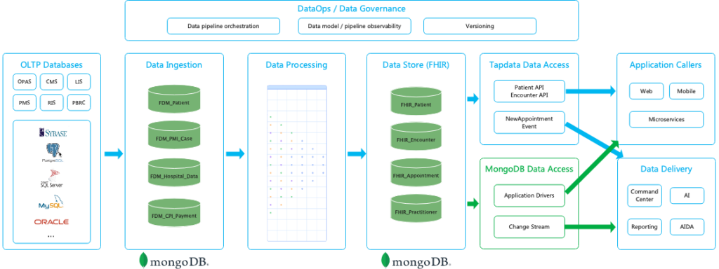 Clinical applications can access the resources through FHIR APIs. Operational services can query the same collections through native database drivers. Analytics pipelines can read the dataset directly without re-implementing cross-system joins.