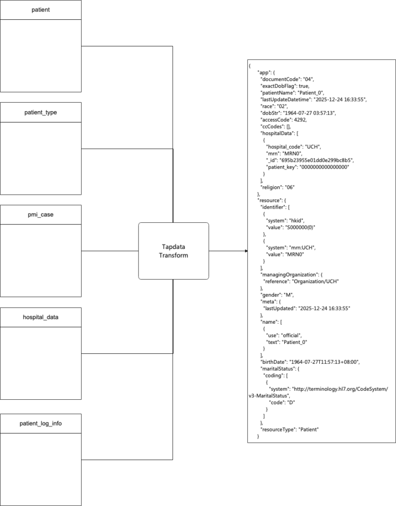 FHIR resources rarely come from a single table or even a single system. A Patient resource might combine identifiers from a registration system, contact details from another system, and insurance information maintained elsewhere. An Encounter resource can later accumulate laboratory observations, diagnoses, medication records, and other clinical events coming from different subsystems.